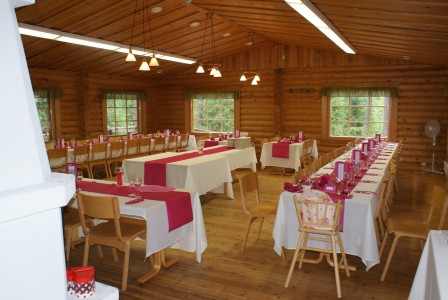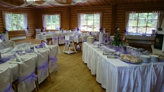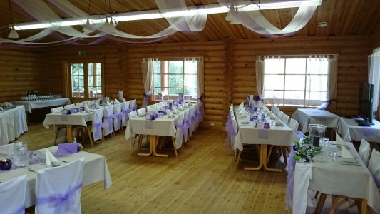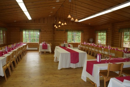 Päärakennus on hieno hirsinen juhlatila. Sisälle mahtuu kattamaan pöydät tilavasti noin 70:lle ja terassille 40:lle. Rakennuksesta löytyy keittiö ja inva-wc.